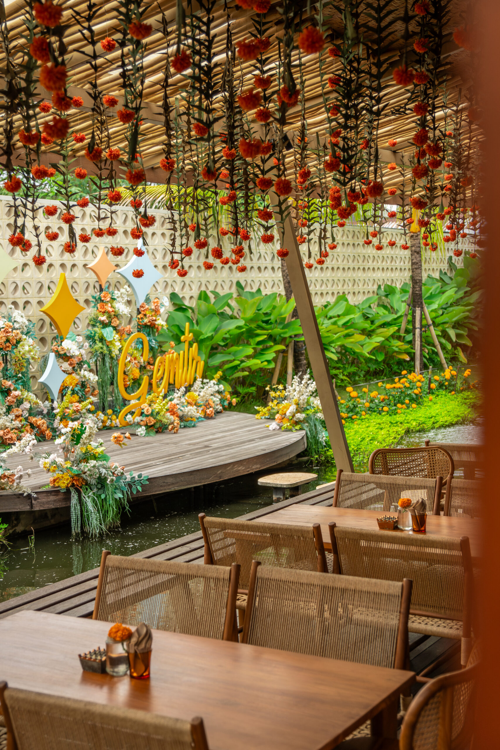 Dengan konsep taman terbuka yang dipenuhi bunga gemitir (marigold), Gemitir Bali menciptakan suasana hangat dan romantis yang cocok untuk dinner maupun berbagai acara spesial.